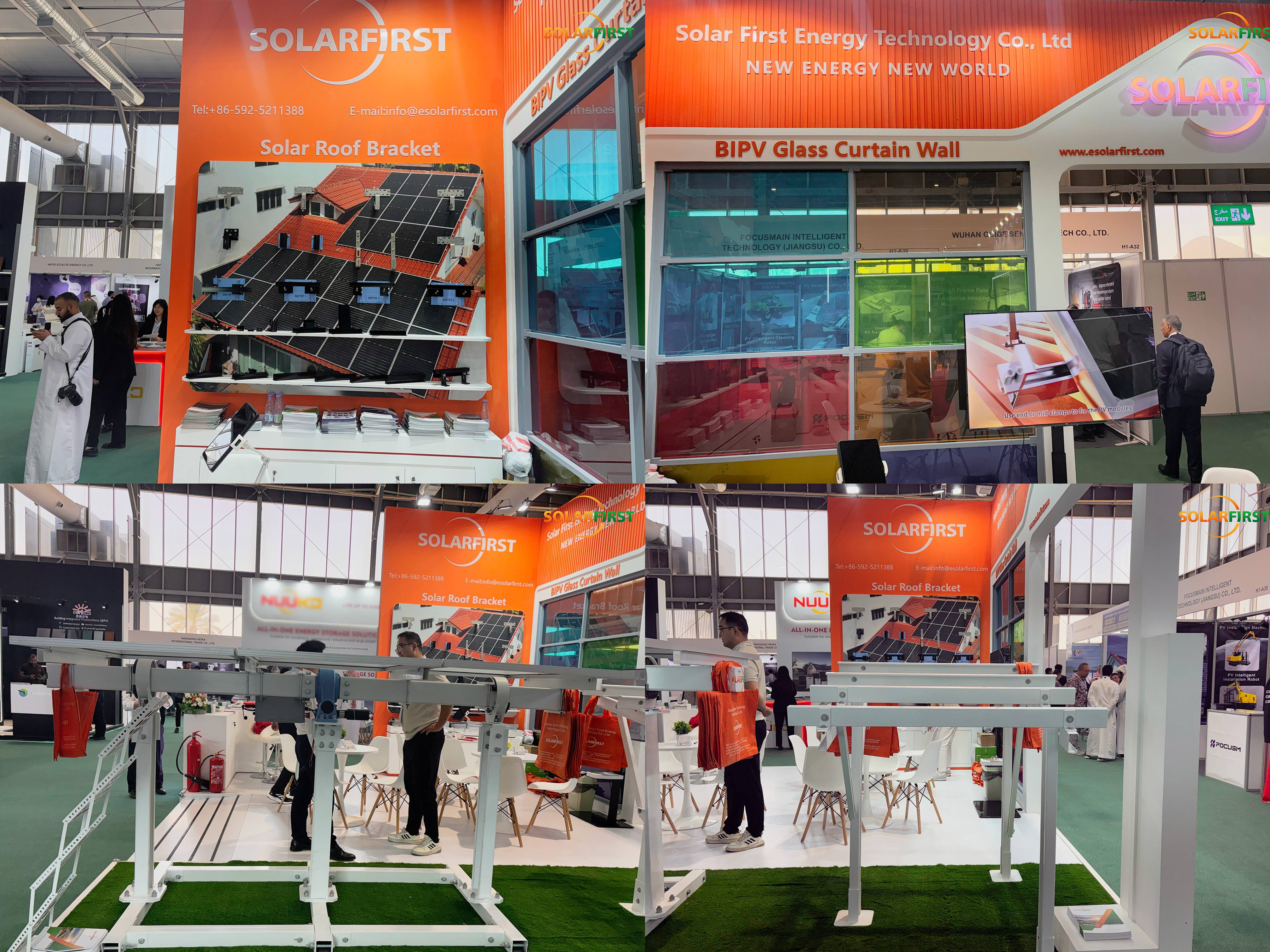 近年来,沙特政府出台了一系列有力政策,积极推动户用及工商业屋顶光伏系统的部署。本次展出的产品针对沙特地区高温、强辐照的气候条件和建筑结构特点进行了专门设计。产品采用耐高温、抗紫外线的铝合金材料,兼具优异的结构强度与轻量化特性,可适配当地常见的混凝土平顶、金属屋面及传统建筑结构,有效应对高温膨胀与风沙环境的考验。